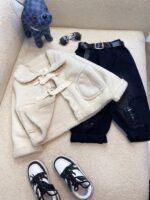روی کت دو سگک چرم بکار رفته و کت به وسیله زیپ سرتا سر بسته میشود